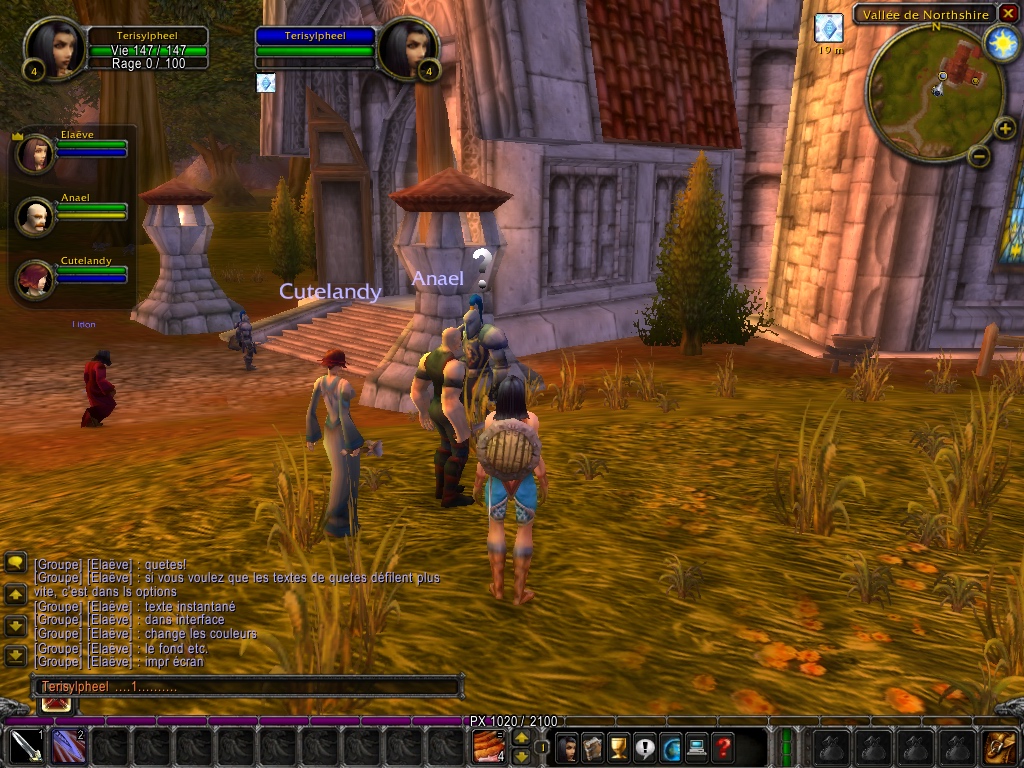 Entre temps, Alice, Mystical et Anael me rejoignent et on part en quête ensemble, tout en apprenant le jeu sous les conseils de Mystical. On a donc une chasseuse, une guerrière, un voleur et une pretresse. On se débrouille bien, et les mobs sont nombreux. Dans la zone où on est ils ne sont pas très aggressifs, et n’attaquent pas à moins d’être attaqués, mais ça change avec le temps.
