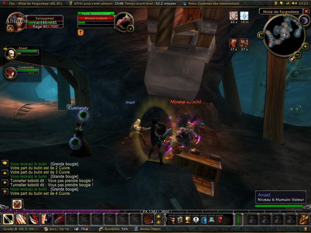 Vous aurez peut-être remarqué que mon interface est un p’tit peu différente d’hier : j’ai en effet installé quelques mods (que je ne maitrise pas encore) parmi les très nombreux mods de la très active communauté de WoW. C’est assez sympa de se dire que n’importe quel défaut d’interface qu’on puisse trouver puisse être corrigé par des joueurs.