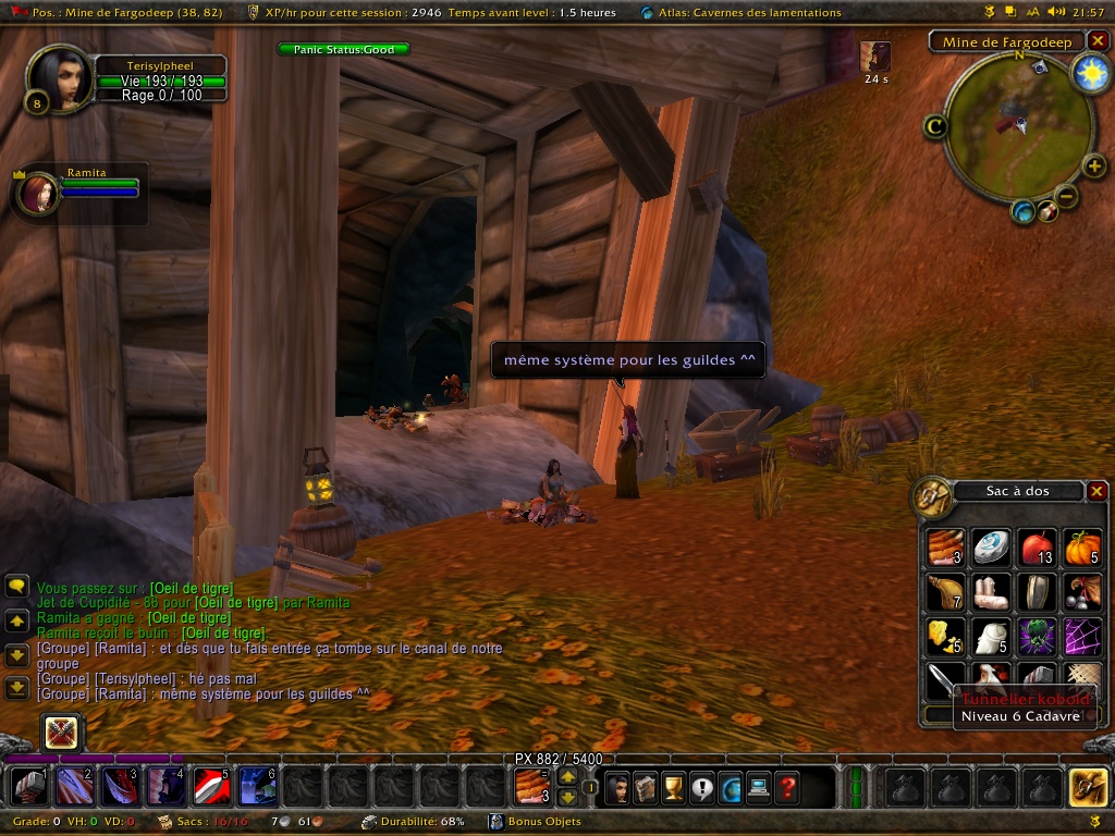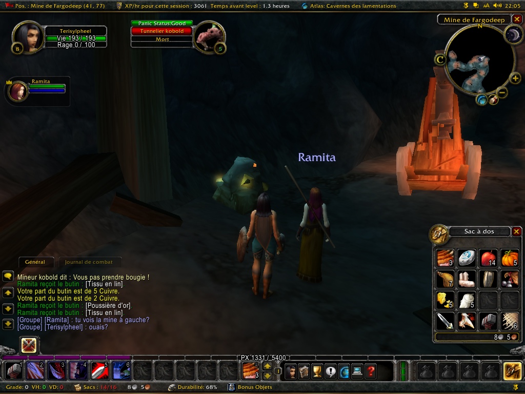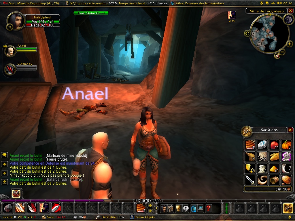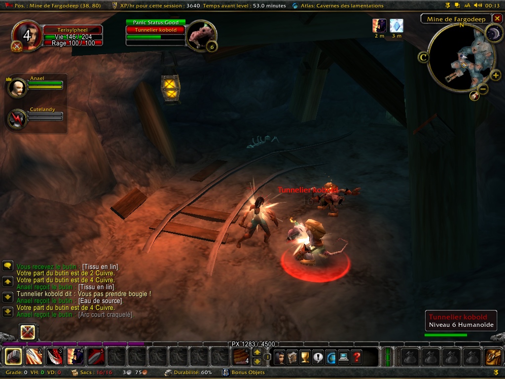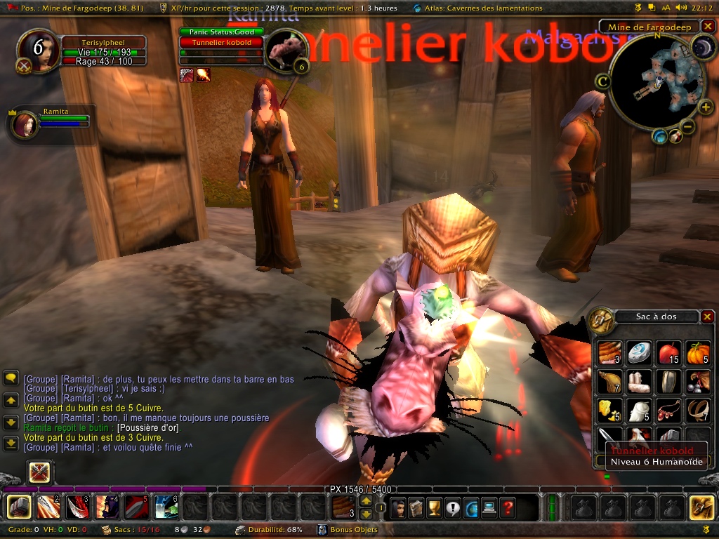 Bon a part ça, on sent que les mobs deviennent un peu plus haineux, et ça va être difficile de soloter en guerrier (j’aurais dû faire palouf (paladin) tiens…)